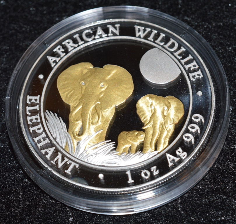 1 oz gilded Somalian Silver Elephant Coin from the African Wildlife Coin Series appeals to coin collectors all over the world for its depiction of one of the most fascinating animals found in Africa: the elephant.
